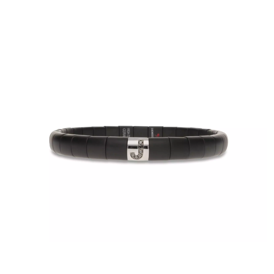 Bracciale pura piccolo in ceramica nera satinata con lettera J in oro bianco e diamanti neri