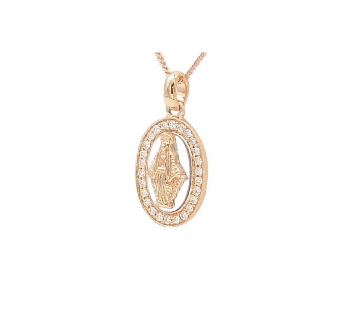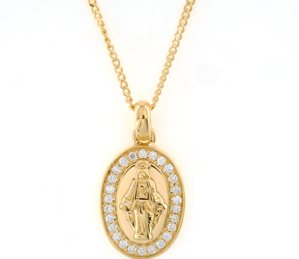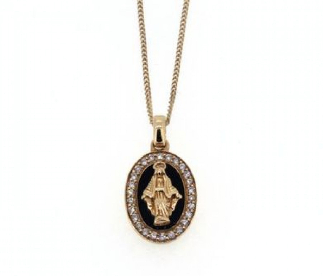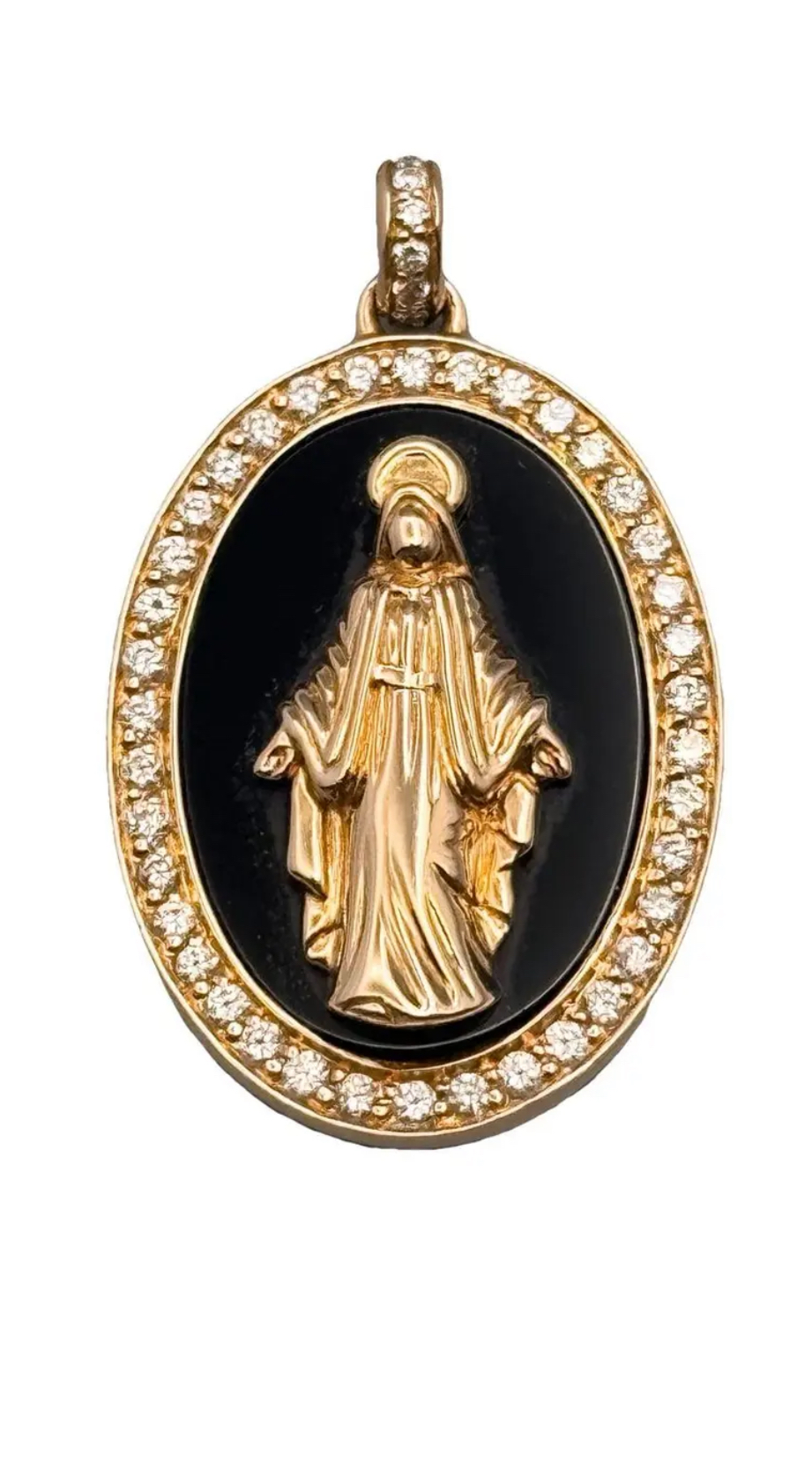 Un simbolo di fede e bellezza eterna. Questo raffinato ciondolo ovale custodisce al suo interno una delicata Madonnina Miracolosa, finemente intagliata a mano con maestria artigianale. Un prezioso abbraccio di diamanti incornicia l’immagine sacra, esaltandone la luce e il significato spirituale. Disponibile in oro bianco, rosa o giallo 18 kt, il ciondolo si completa con un fondo in onice nero profondo o in madreperla candida, per un contrasto di luce e ombra che rende ogni pezzo unico. Un gioiello da indossare ogni giorno come protezione del cuore e simbolo di devozione discreta ma preziosa.